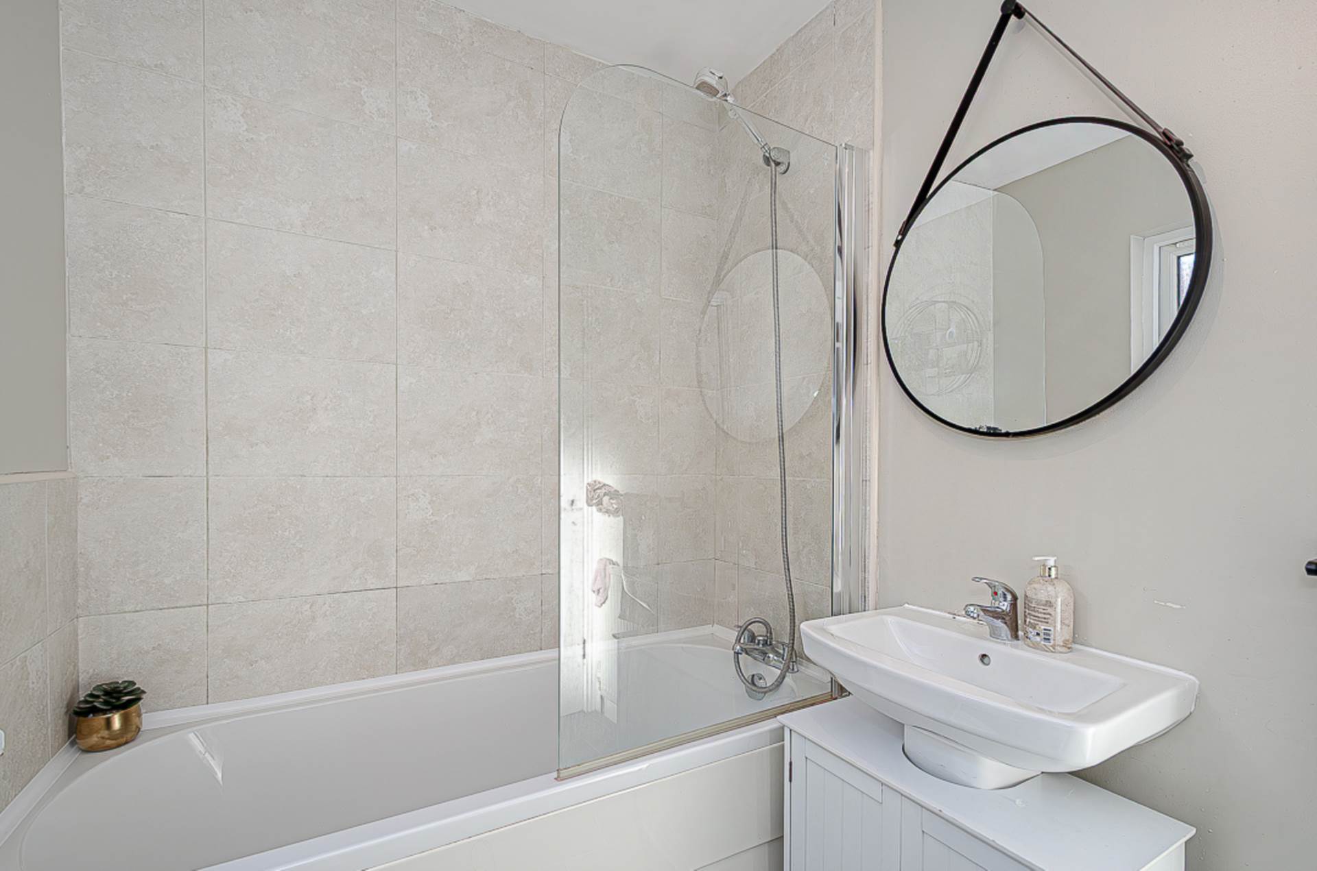 Bedroom 4/study - 7'6" (2.29m) x 6'11" (2.11m)Bathroom - 6'10" (2.08m) x 5'6" (1.68m)White suite with shower attachment and screen over bath, wash hand basin, W.C., modern tiled walls, ceramic tiled floor, spotlights and extractor fan
