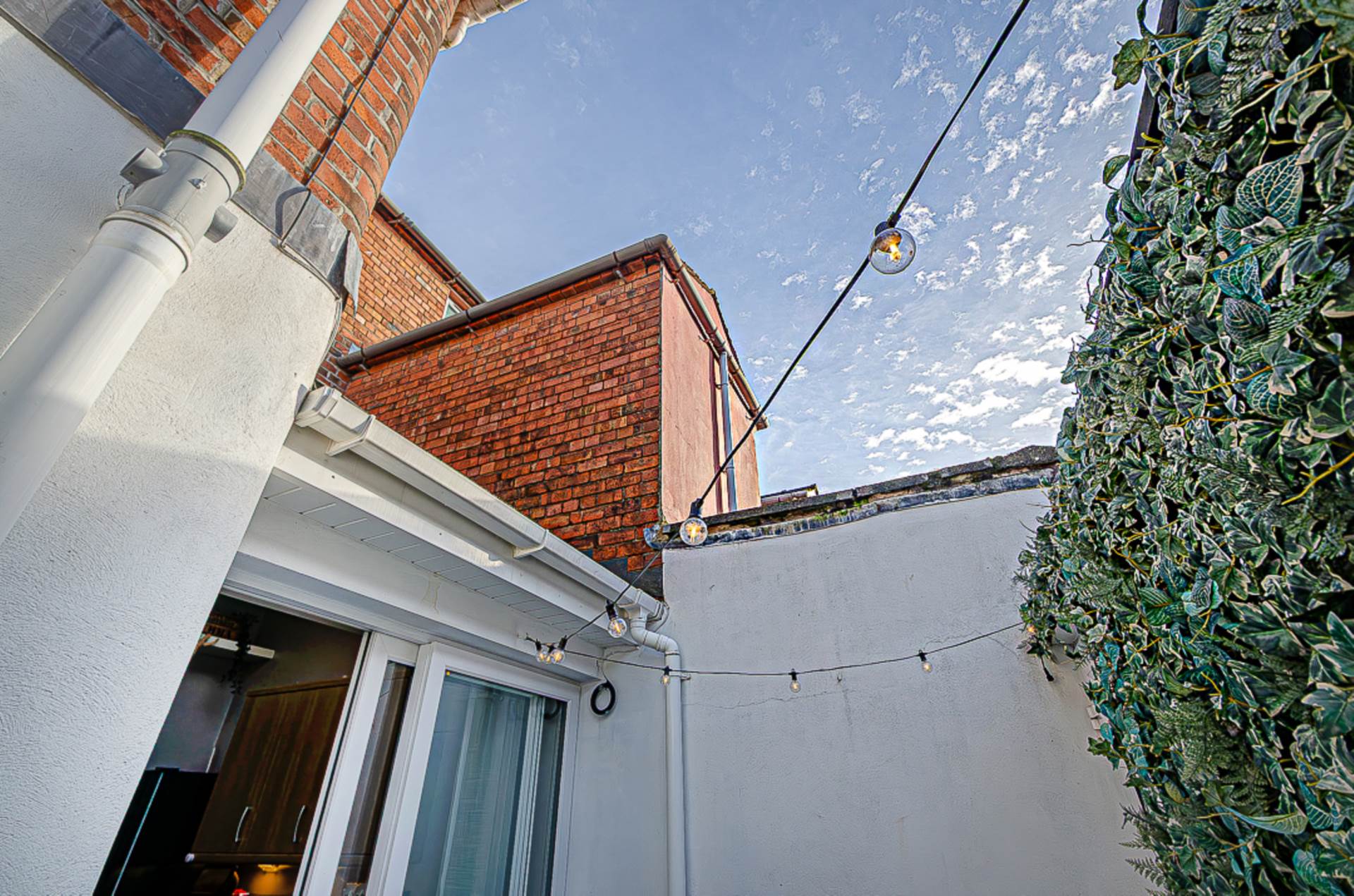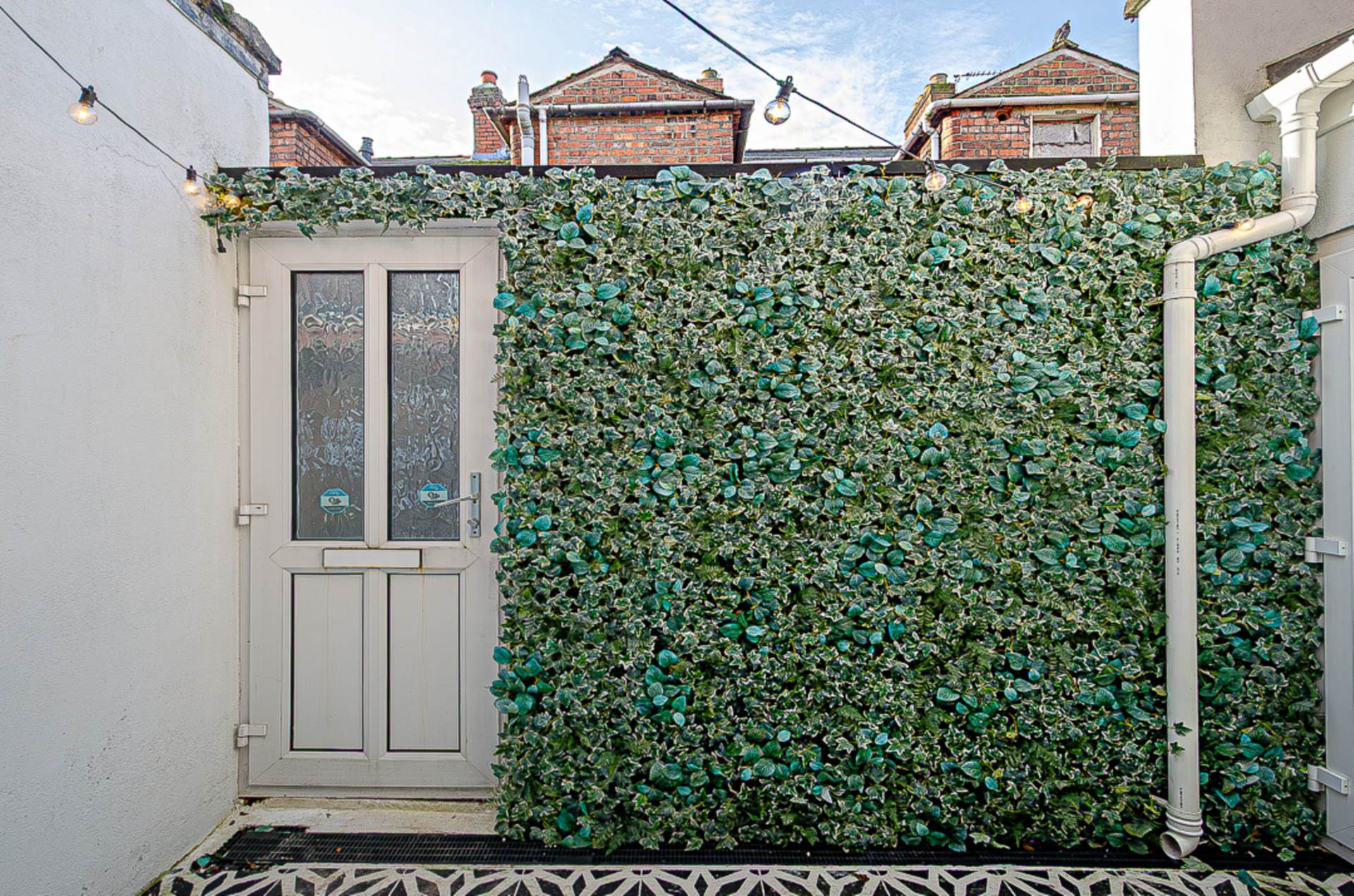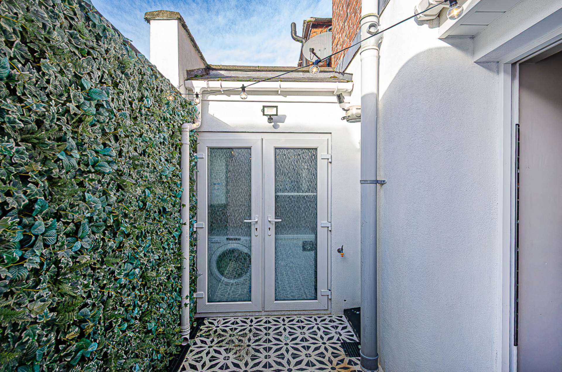 OutsideEnclosed rear yard in decorative tiling with outside store - light, power, gas boiler and plumbing for washing machine