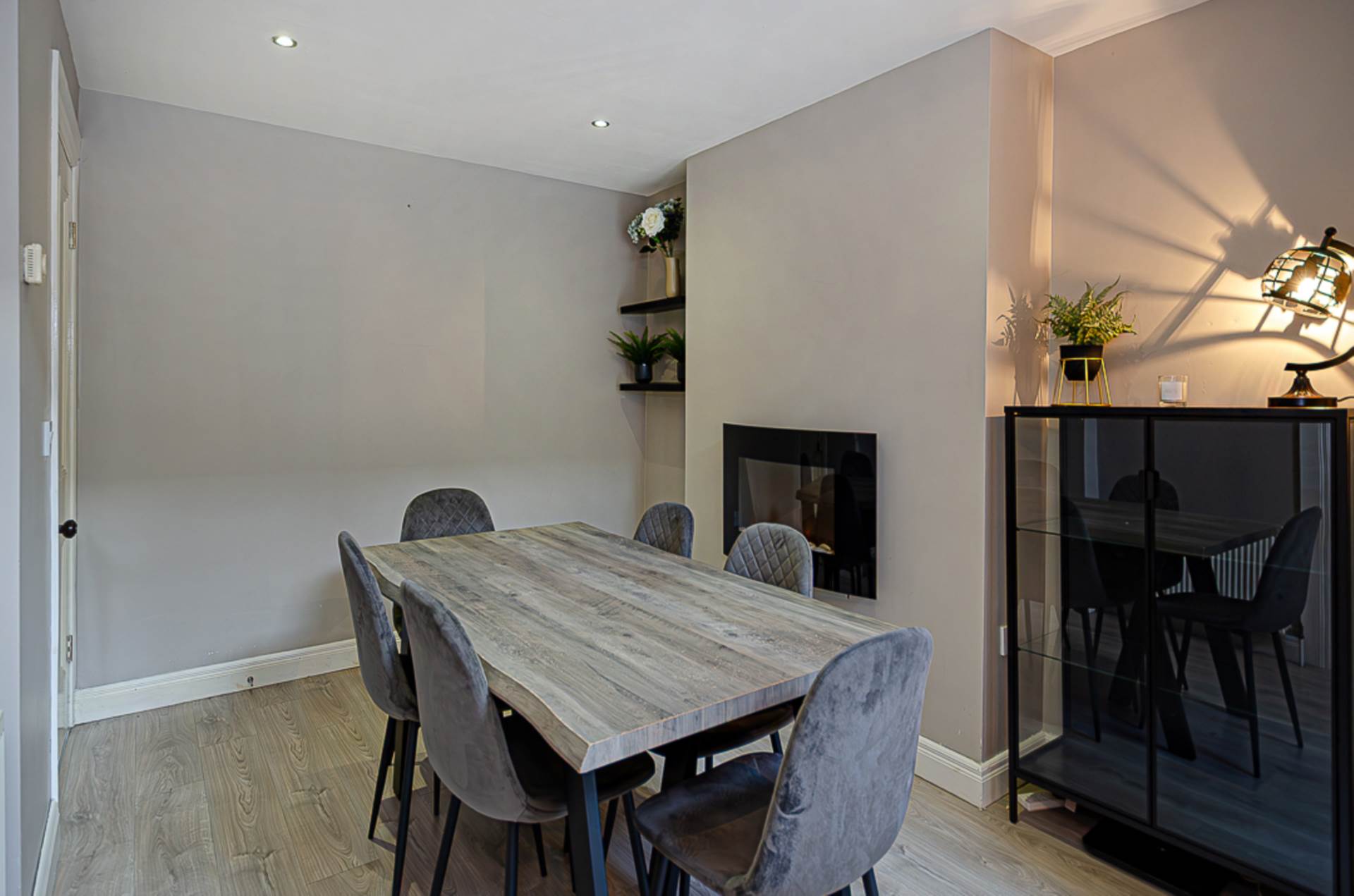 DiningTimber laminate floor, wall hung electric electric fire, recessed spotlights, and storage under stairs