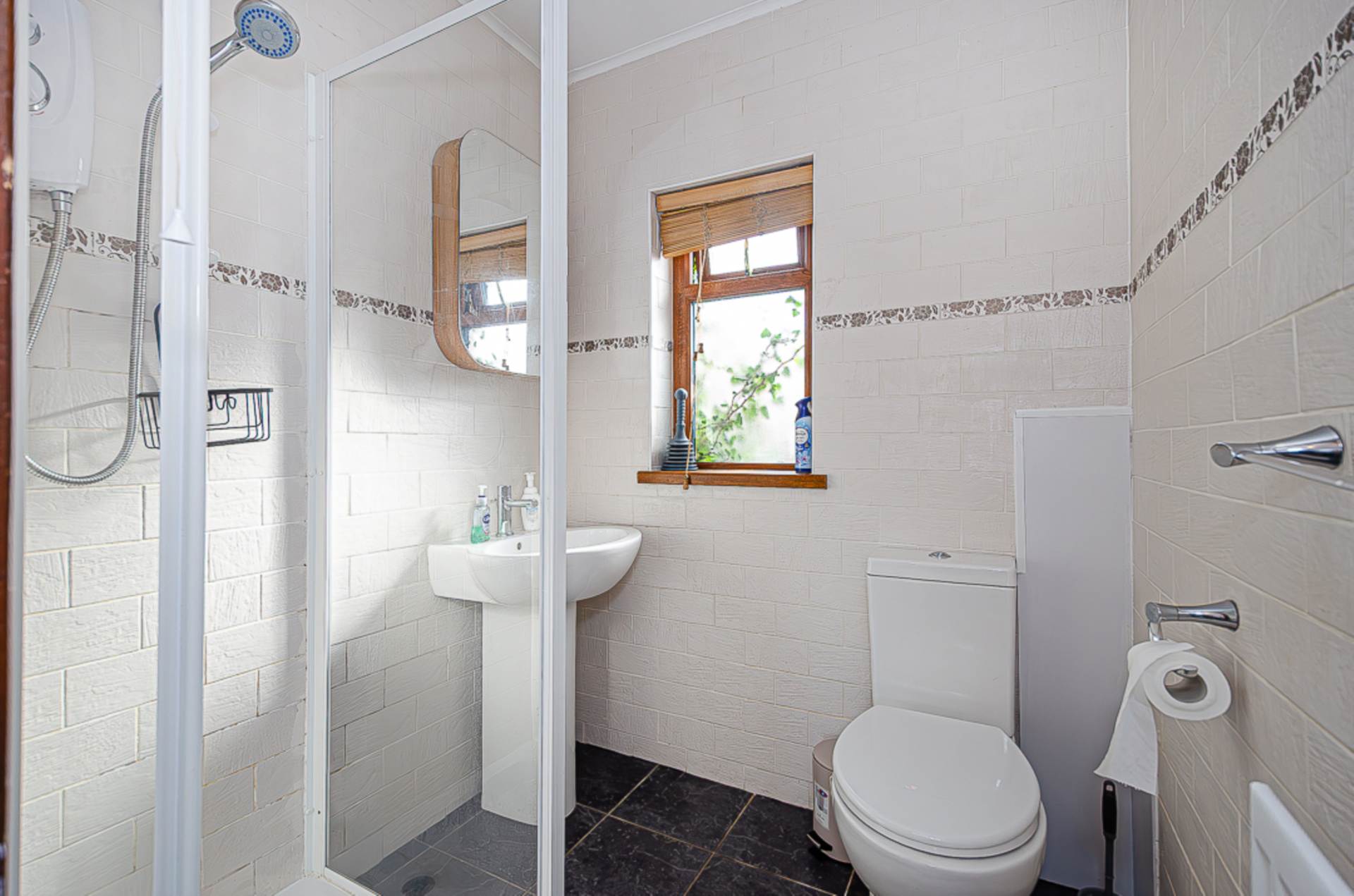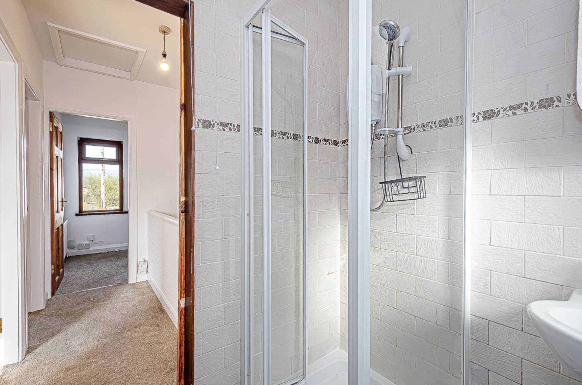 Bedroom 3 - 6'3" (1.91m) x 5'6" (1.68m)Shower room - 5'4" (1.63m) x 5'3" (1.6m)Corner shower cubicle with electric shower and folding door, wash hand basin, W.C., modern tiled walls, ceramic tiled floor, and extractor fan