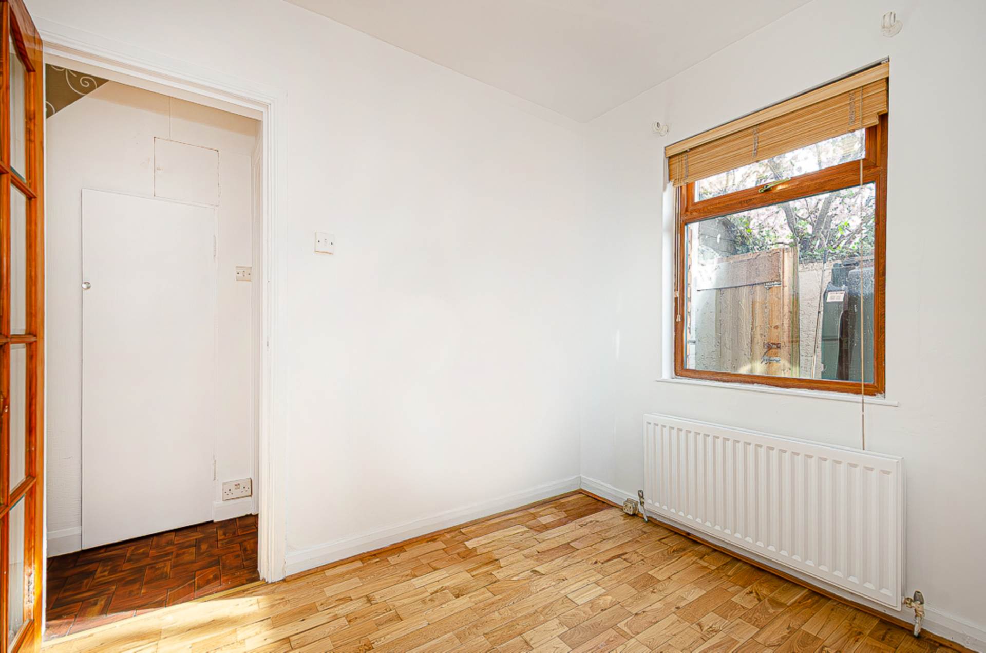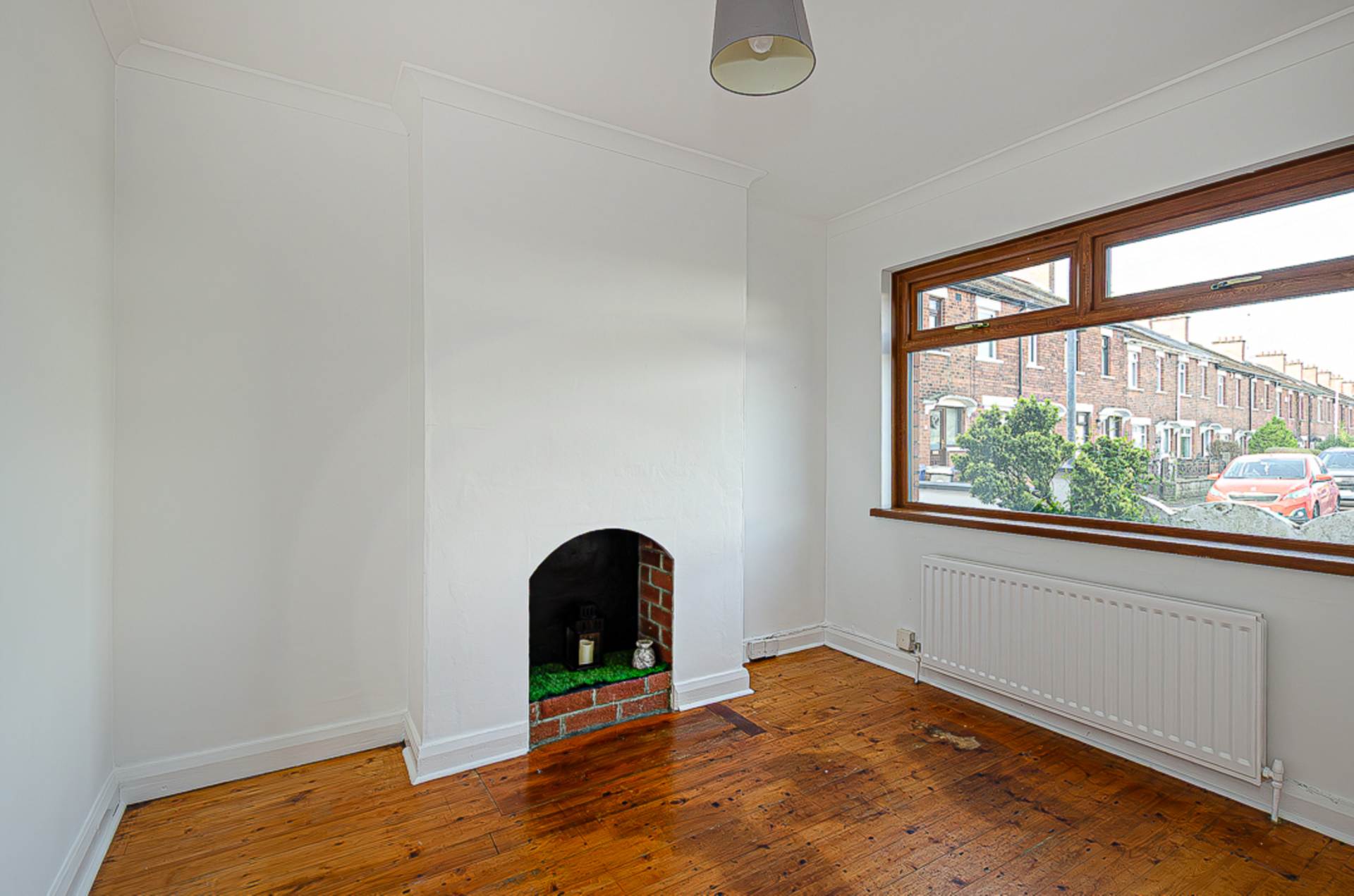 Living room - 9'11" (3.02m) x 9'6" (2.9m)Hole in the wall fireplace and original floorboards