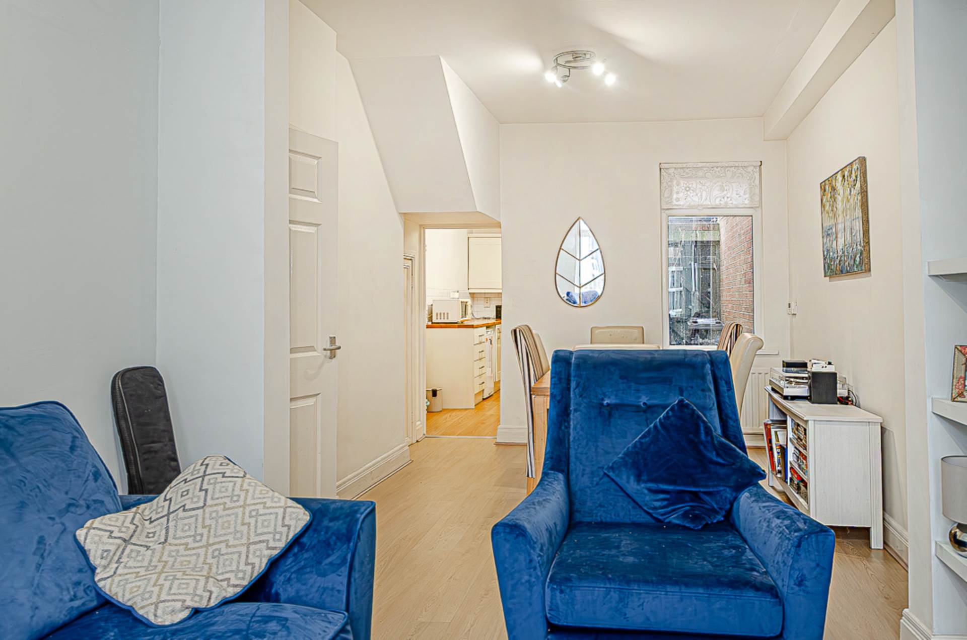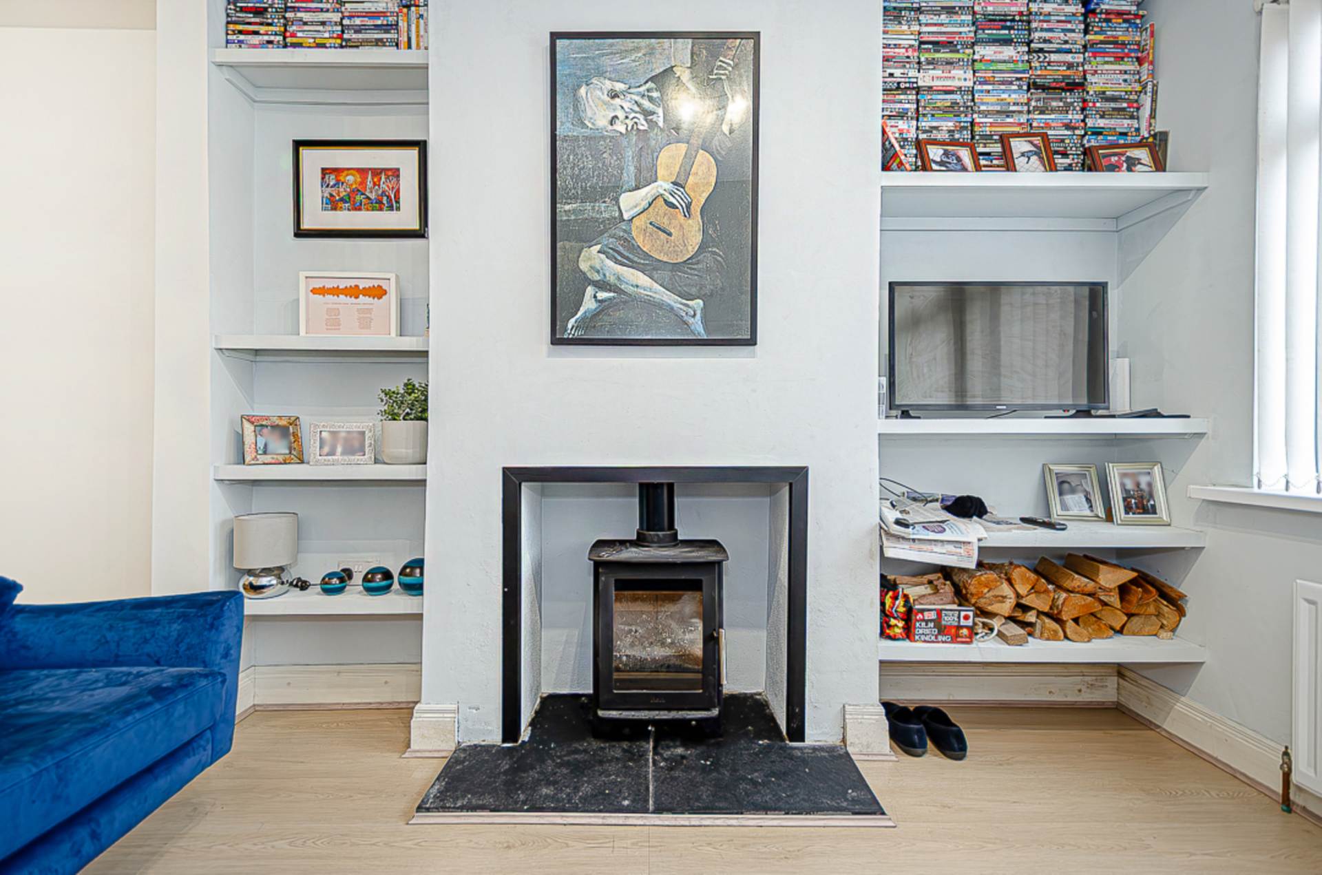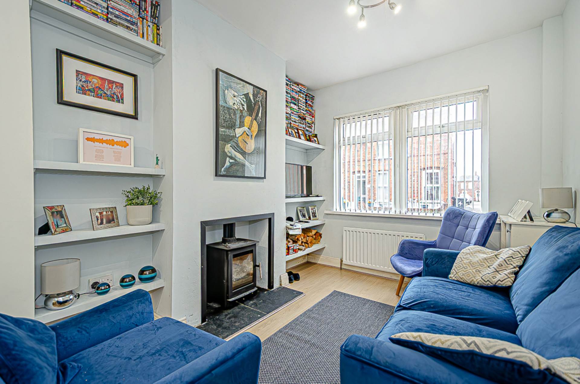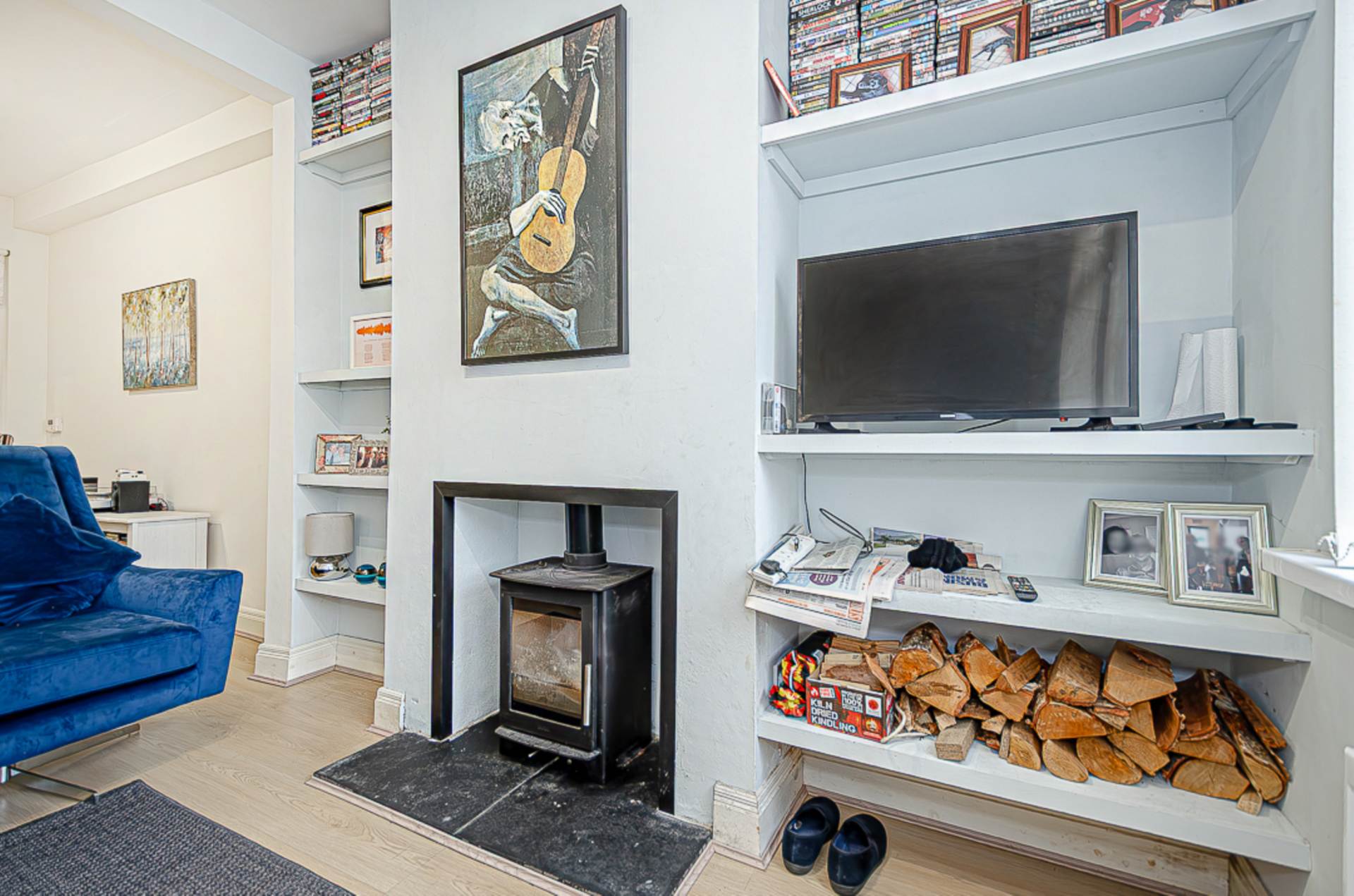 Through lounge - 21'10" (6.65m) x 10'2" (3.1m)Hole in the wall fireplace with slate hearth and wood burner, built in shelving, timber laminate floor and spotlights
