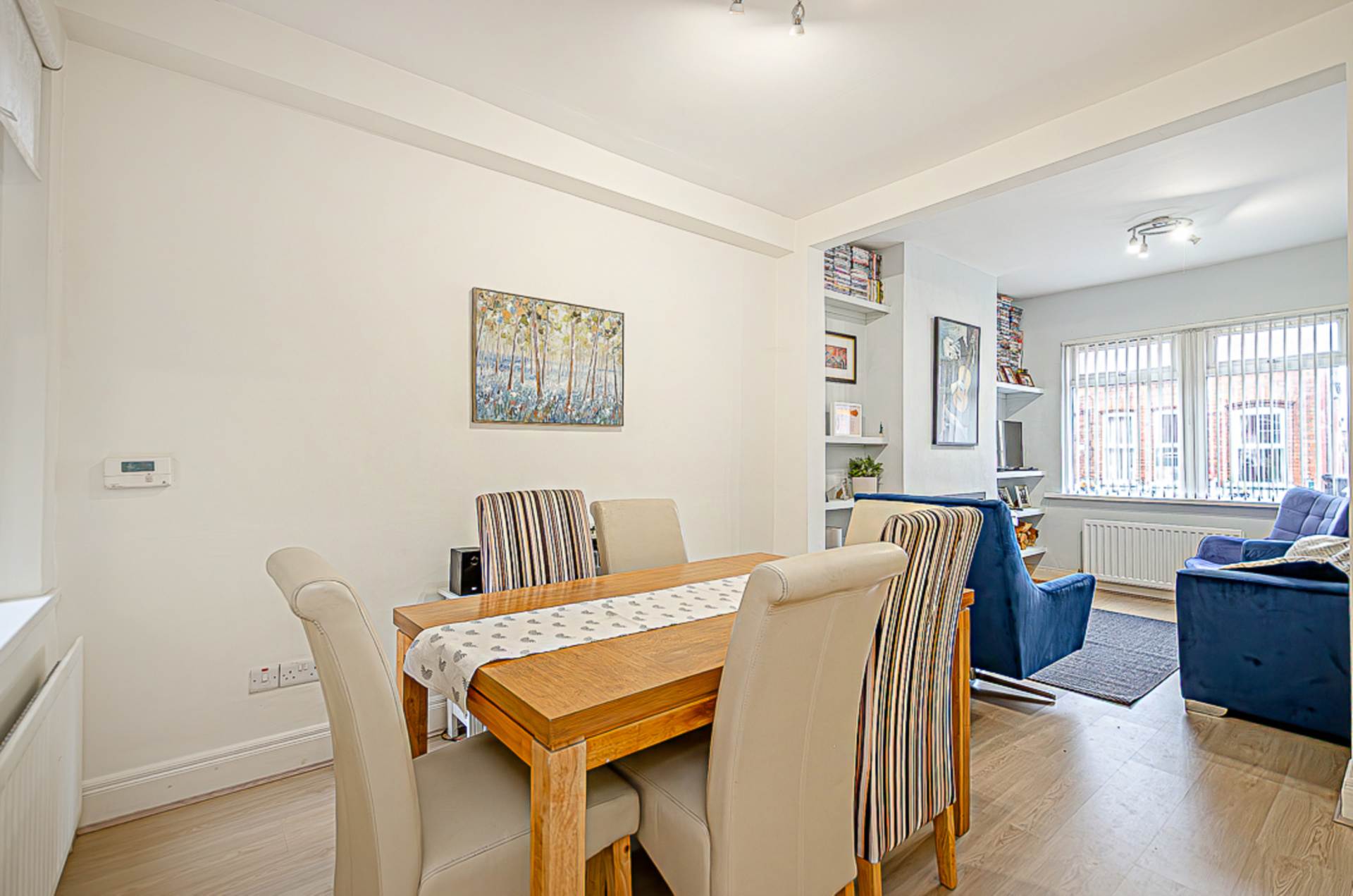 Upon entering, you are greeted by a bright and welcoming entrance hall, finished with attractive timber-effect laminate flooring that flows seamlessly through the ground floor. The impressive through lounge and dining area provides a generous and versatile living space, enhanced by a feature hole-in-the-wall fireplace with a wood-burning stove creating a cosy focal point ideal for both relaxing and entertaining.