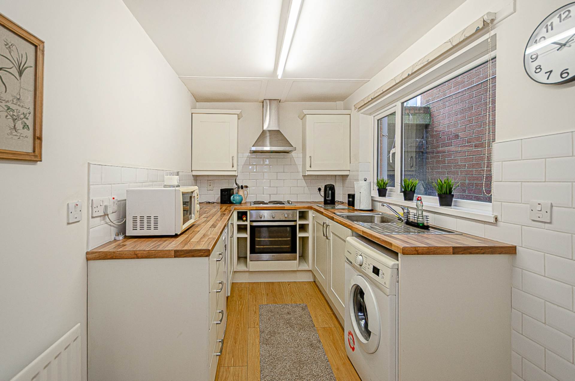 Kitchen - 12'8" (3.86m) x 7'1" (2.16m)Range of high and low level fitted units, stainless steel oven, stainless steel hob, stainless steel extractor canopy, wine rack, part tiled walls, timber laminate floor and plumbing for washing machine