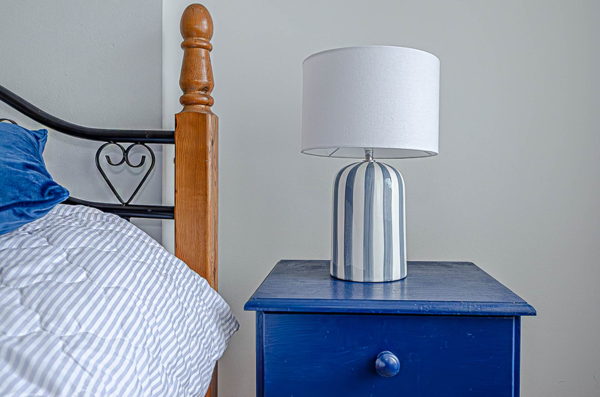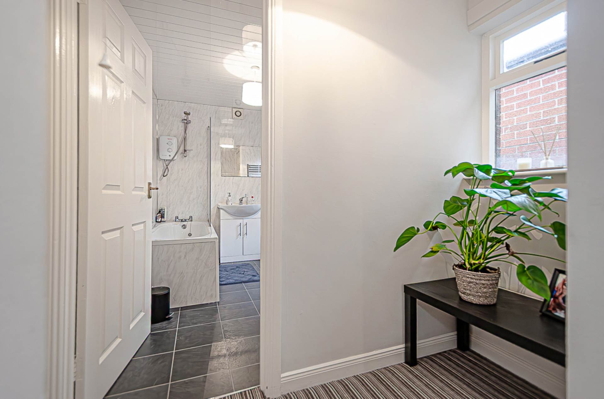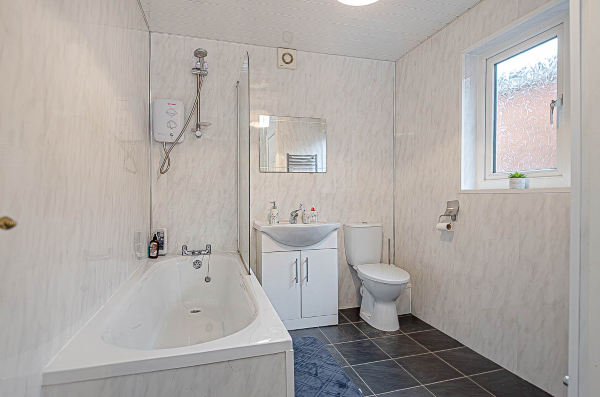 Upstairs, the home comprises two well-proportioned bedrooms, each enjoying excellent natural light and comfortable accommodation. The accommodation is completed by a modern bathroom fitted with a high-quality white suite, including a bath with electric shower overhead, vanity unit with integrated basin, and WC, all finished with elegant tiling and sleek chrome fittings.