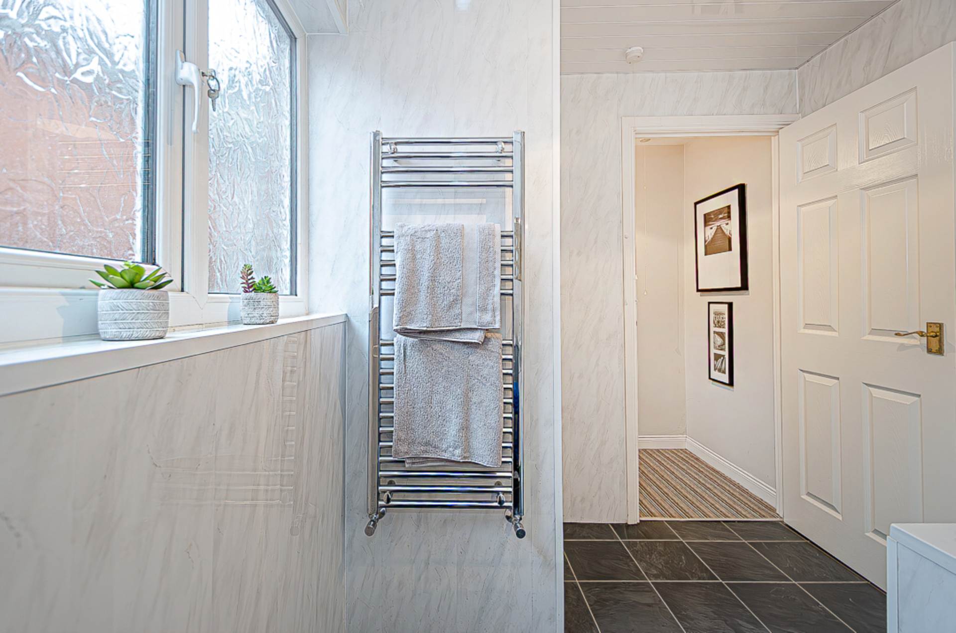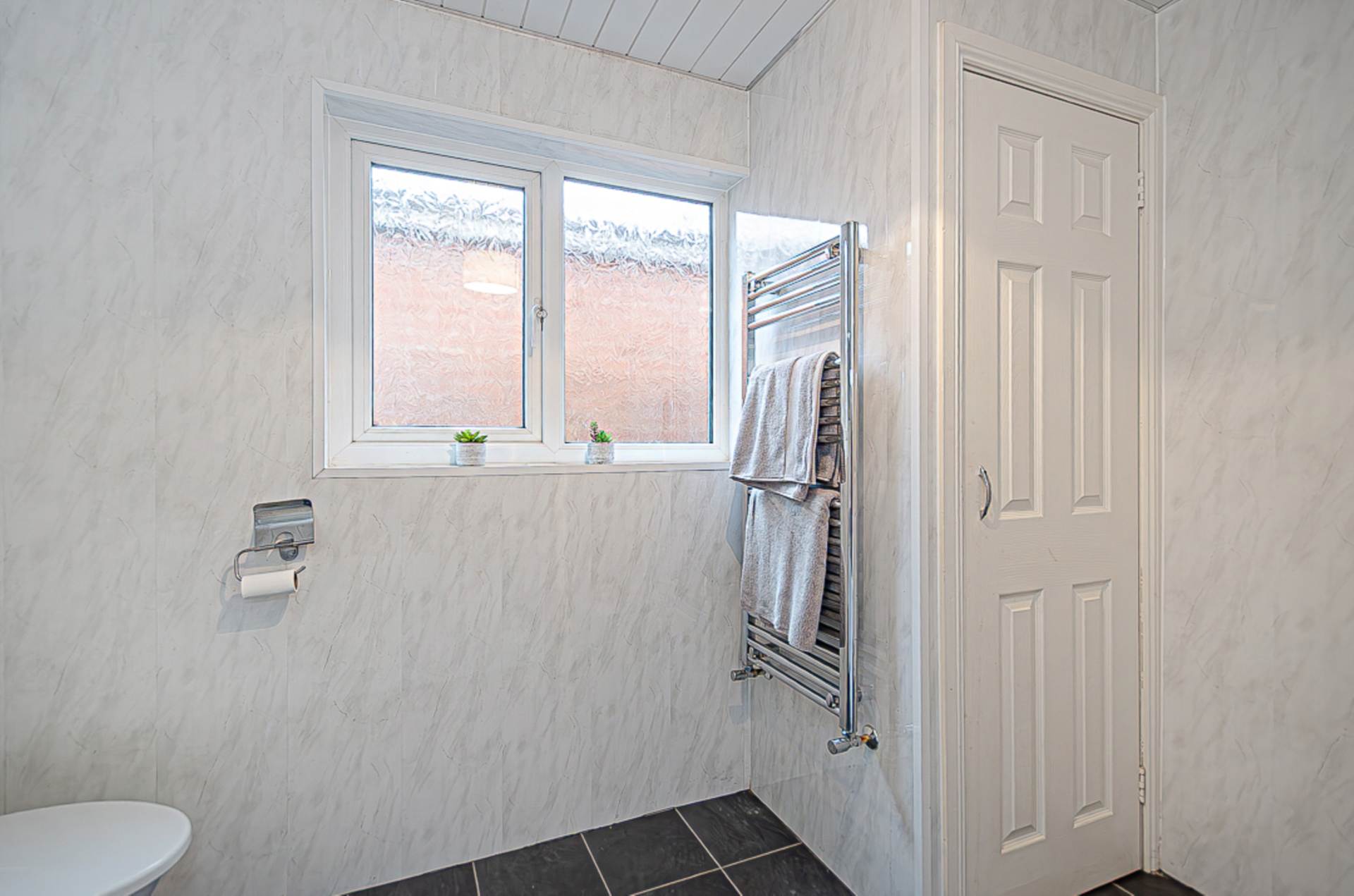 LandingBathroom - 9'3" (2.82m) x 7'0" (2.13m)White suite with electric shower and screen over bath, wash hand basin in vanity unit, W.C., P.V.C. panelled walls, ceramic tiled floor, P.V.C. panelled ceiling, chrome towel rail radiator, and gas boiler in cupboard