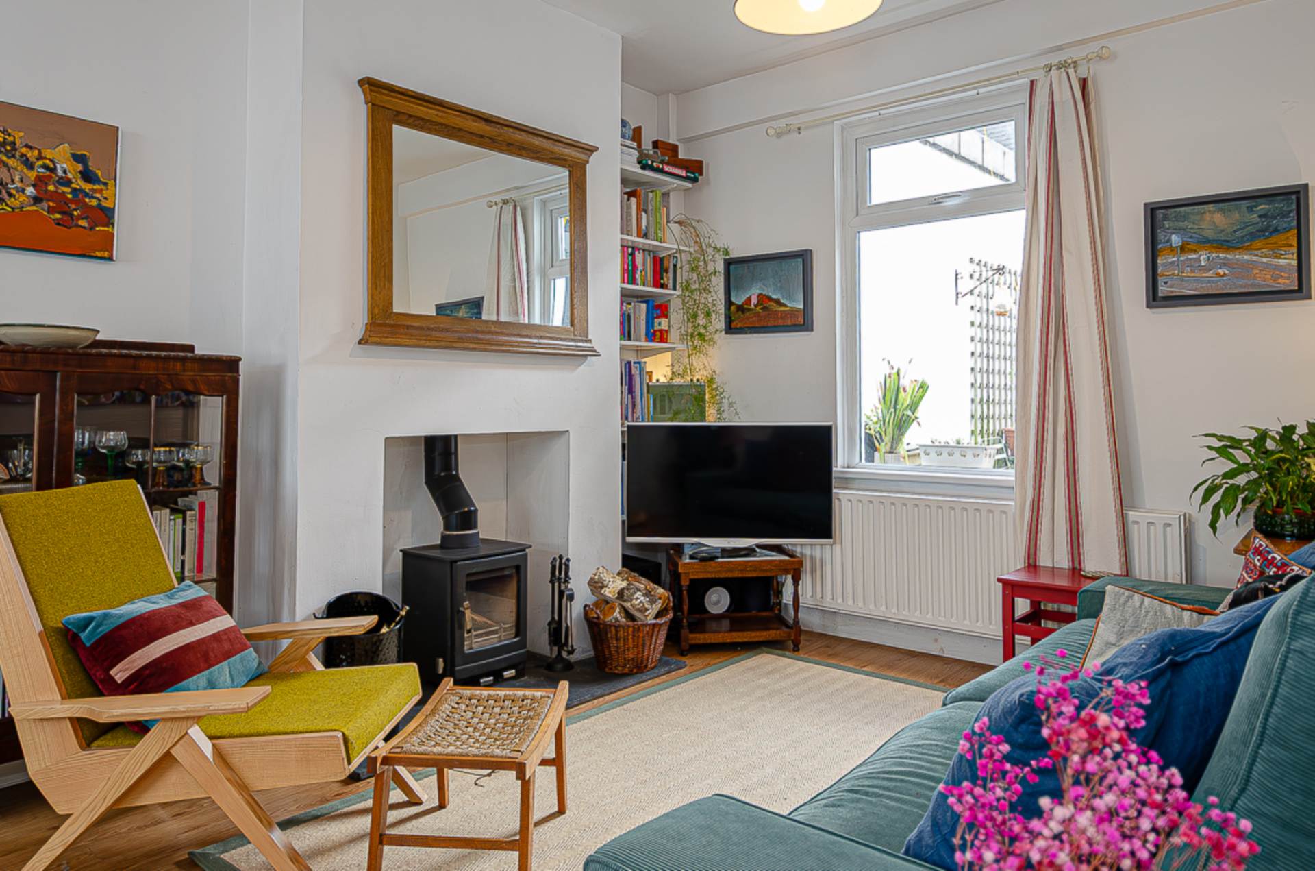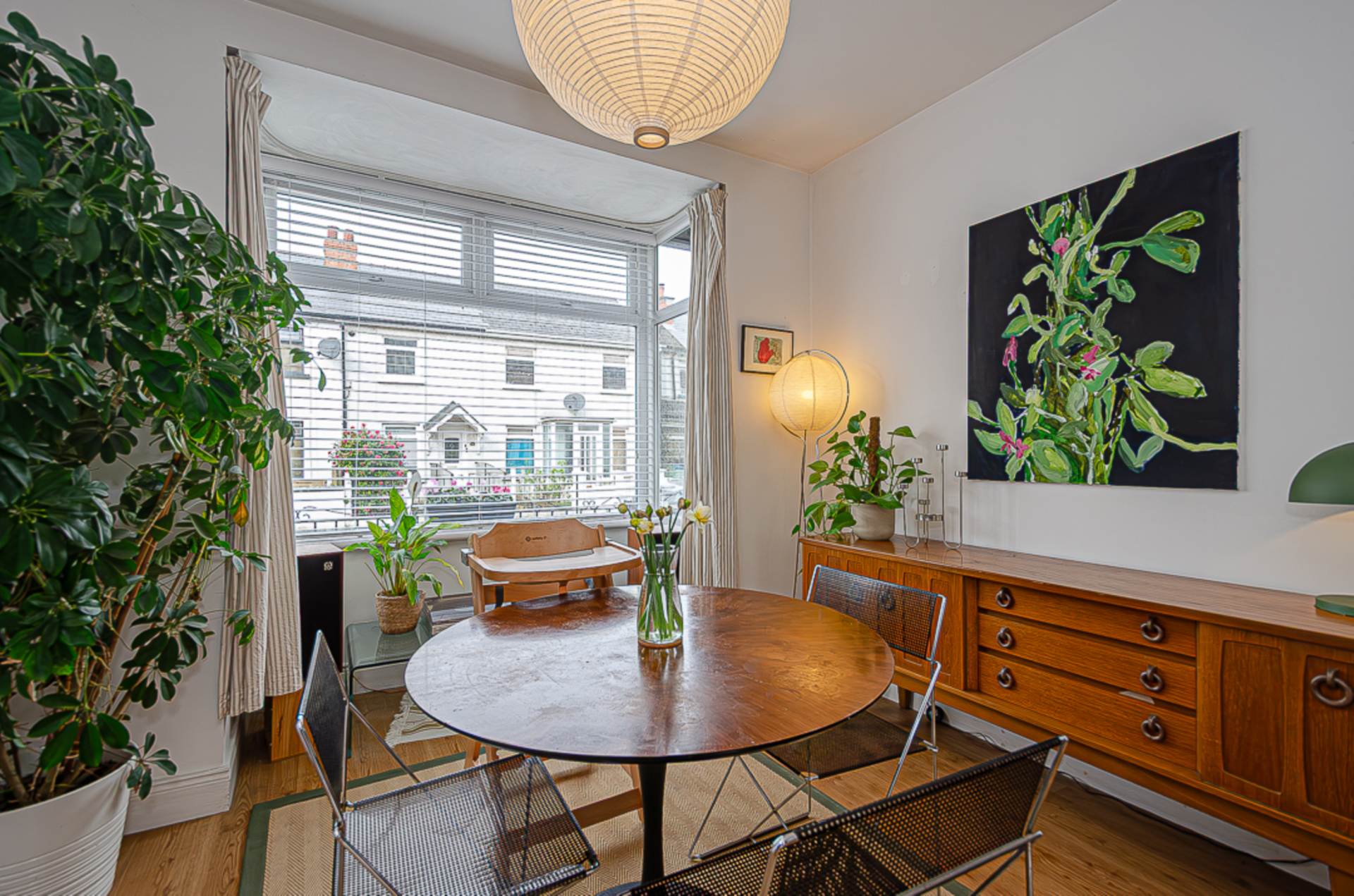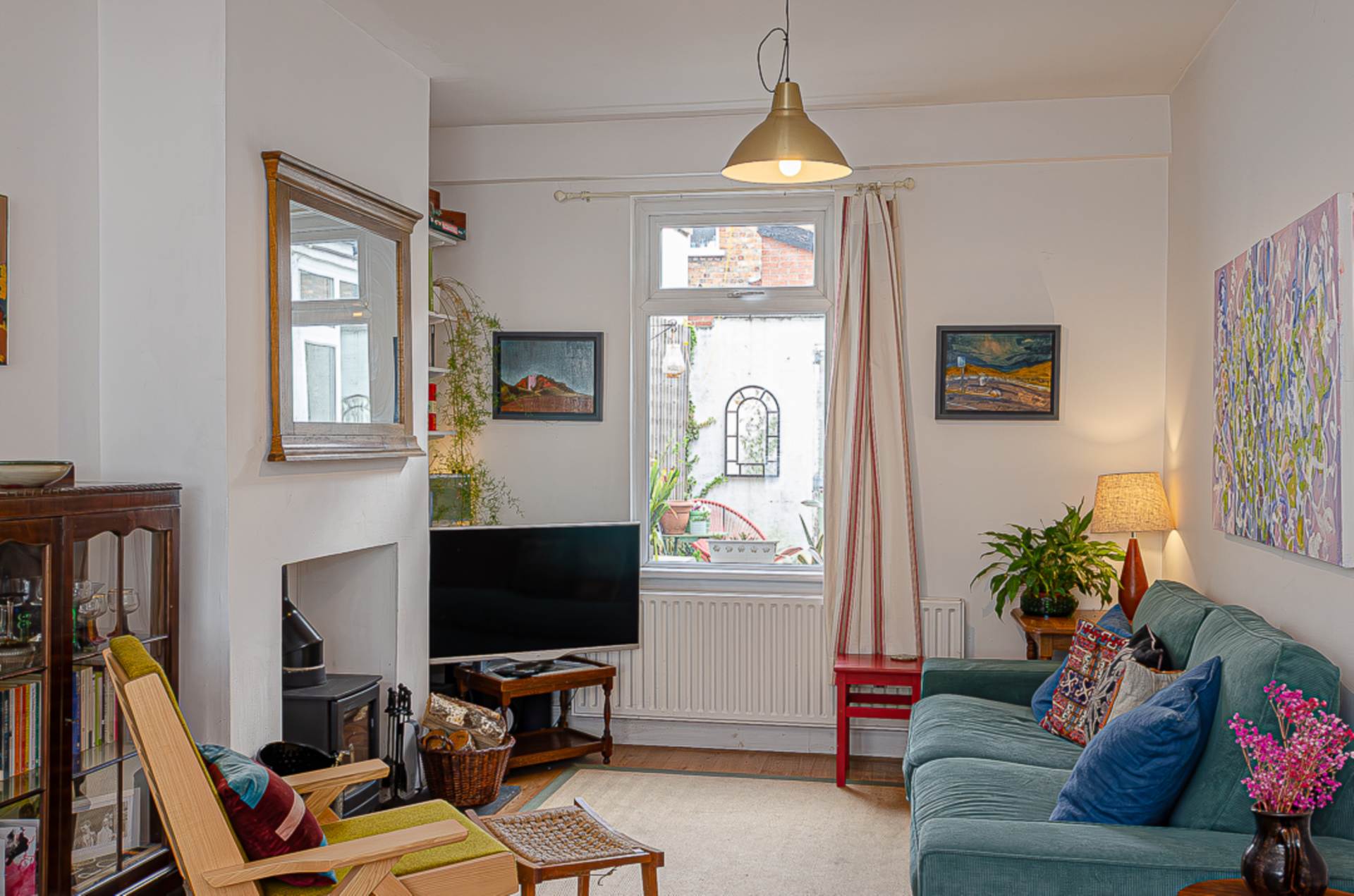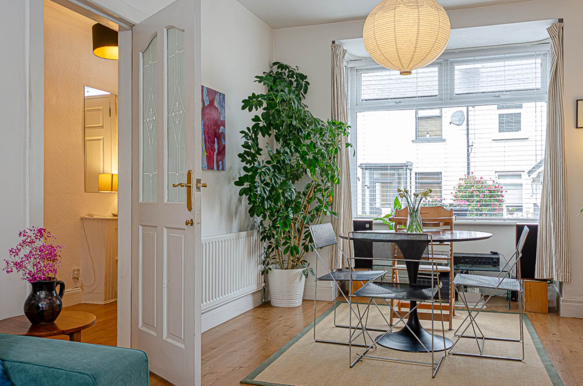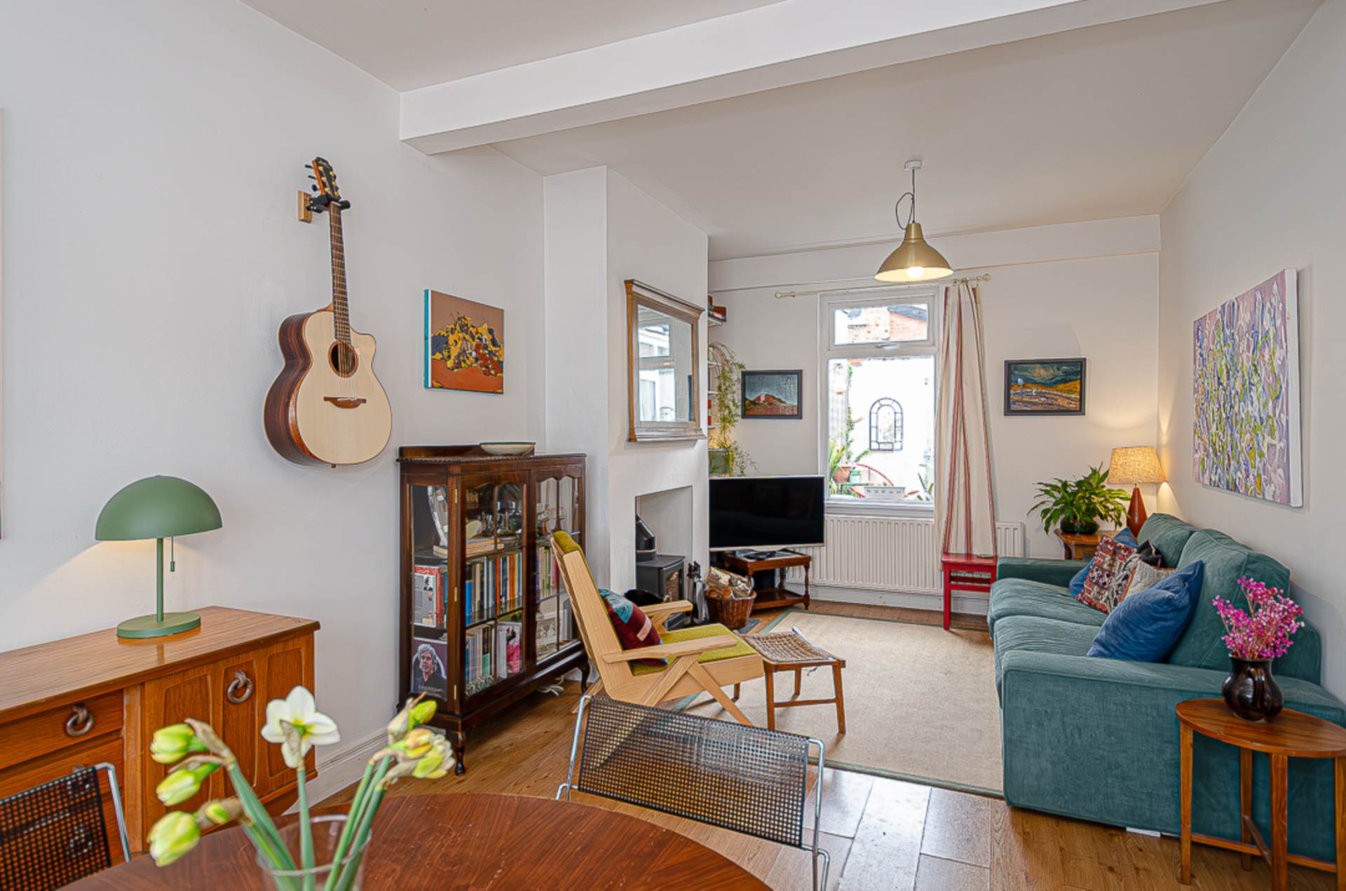 Through lounge - 22'11" (6.99m) x 10'1" (3.07m)Bay window, hole in the wall fireplace with slate hearth, and timber laminate floor