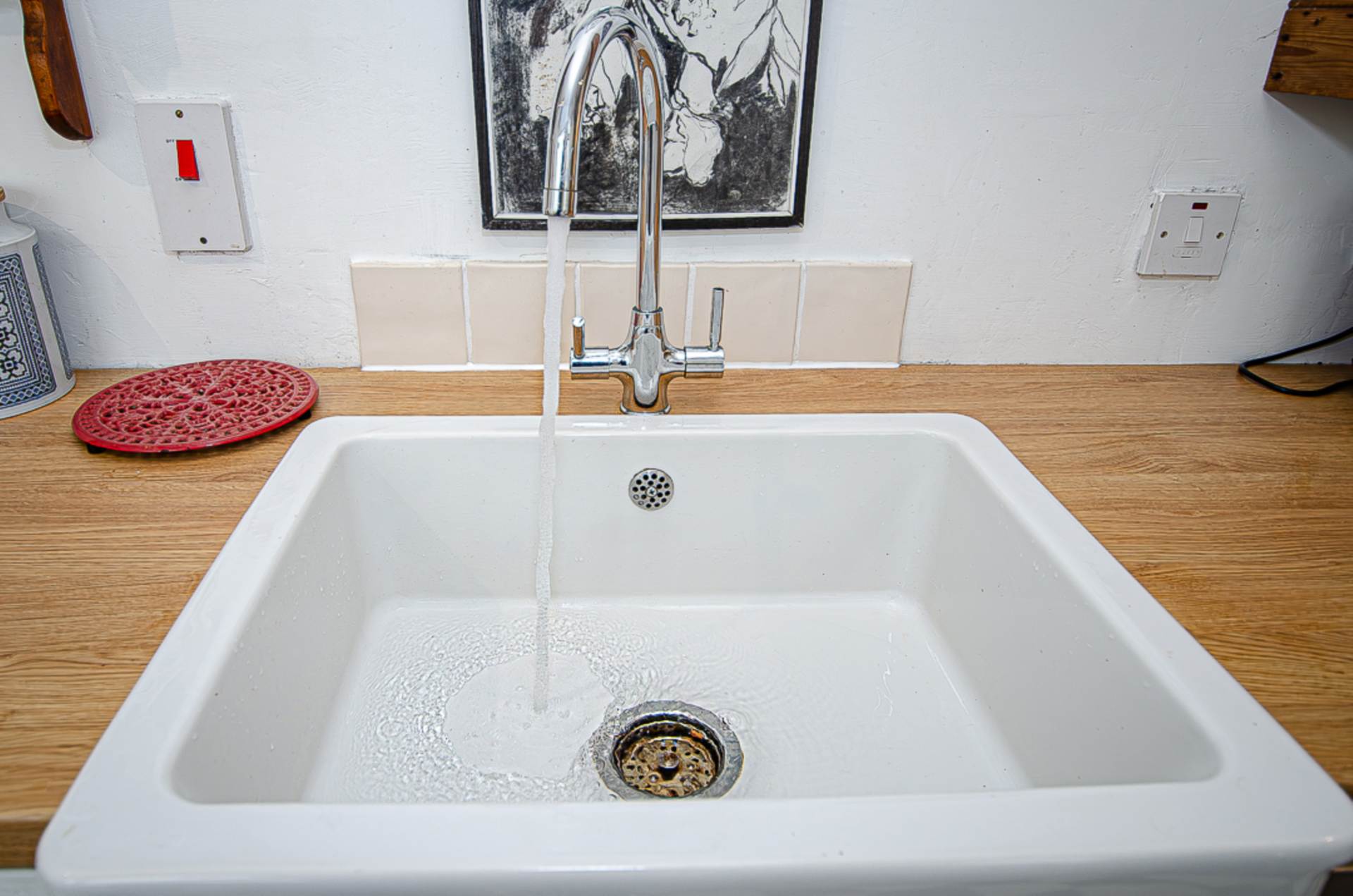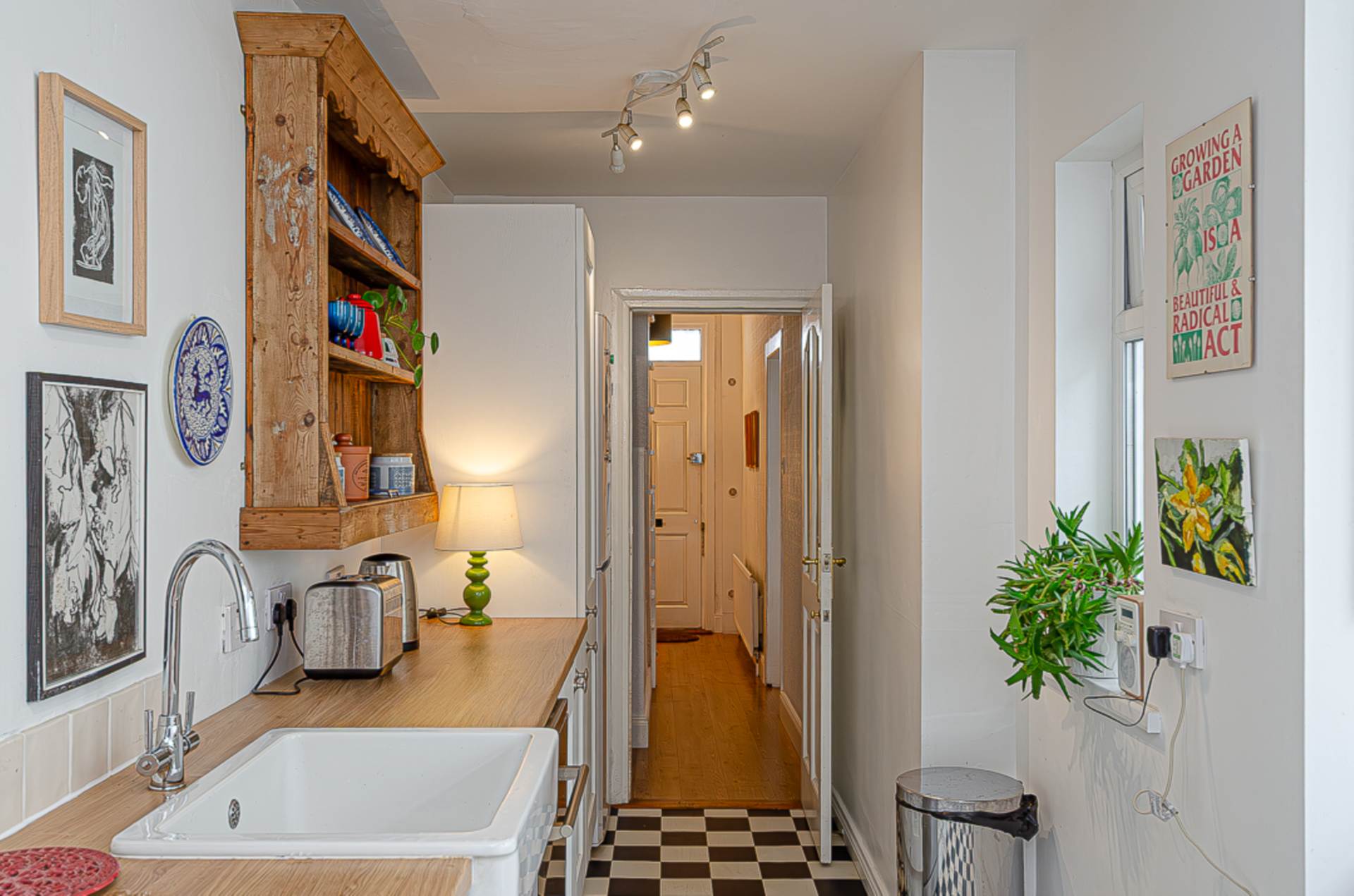 Kitchen - 17'6" (5.33m) x 8'0" (2.44m) MaxRange of high and low level units, stainless steel oven, ceramic hob, tiled splashback, stainless steel and glass extractor canopy, Belfast sink, built in shelving, spotlights, and plumbing for dishwasher