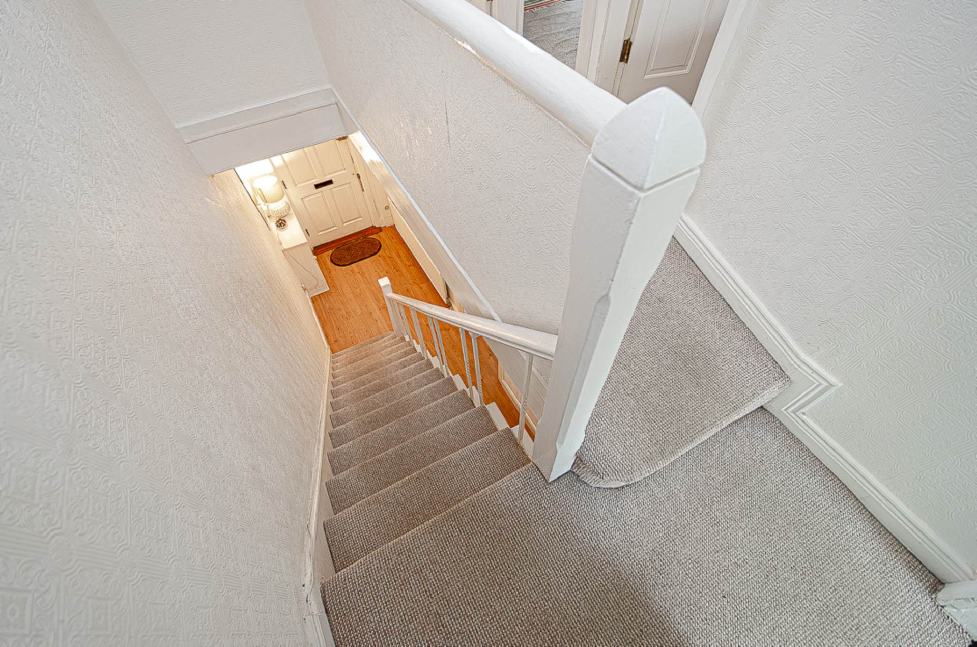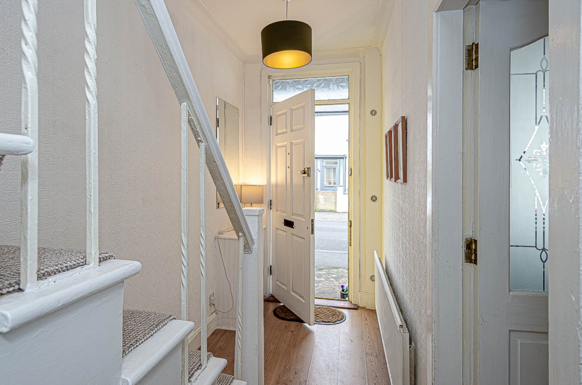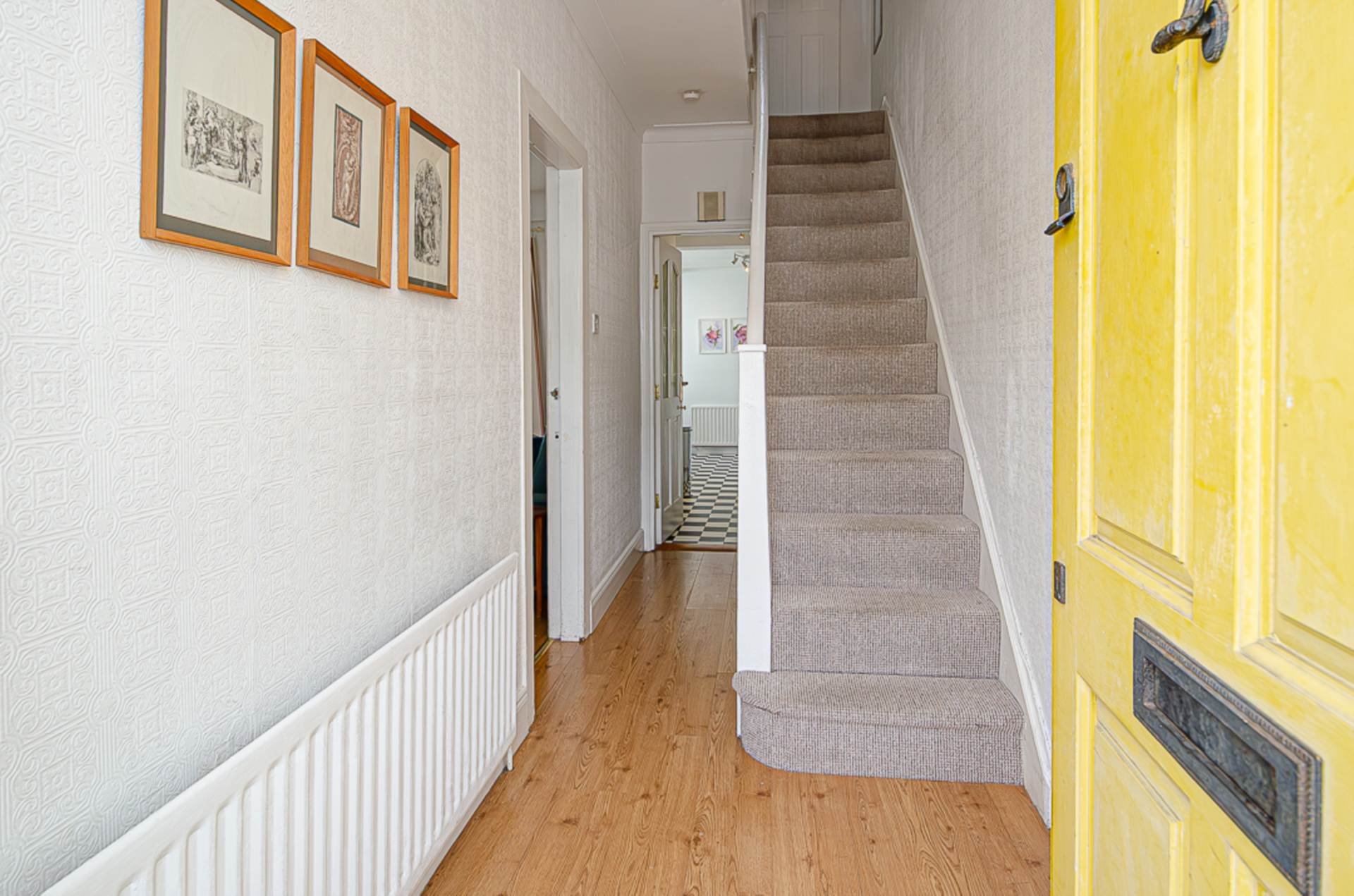 Entrance hallStorage under stairs, cornice and timber laminate floor
