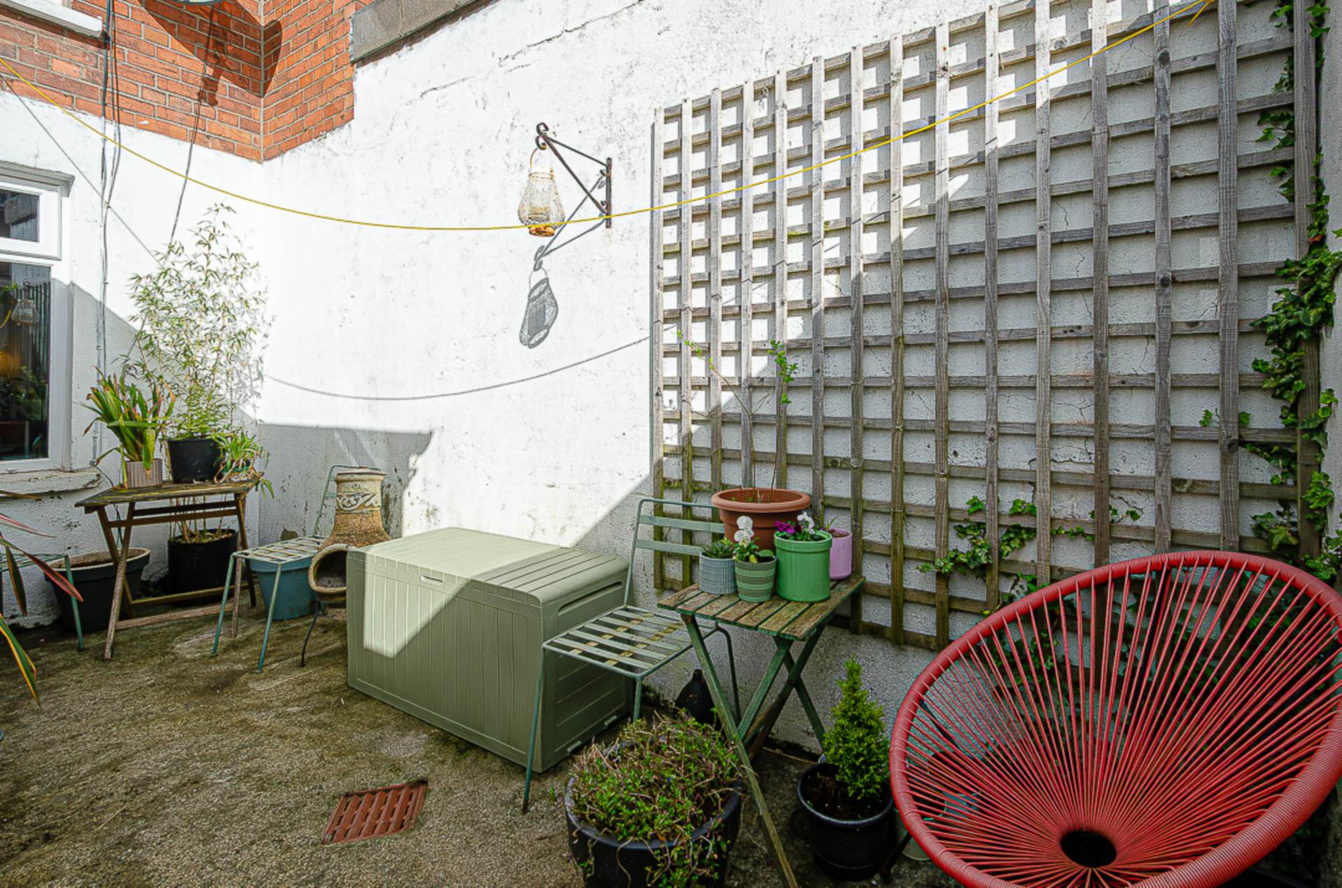OutsideForecourt in stones and path. Enclosed rear yard with space for sitting out and outside store (Plumbing for washing machine, space for tumble dryer and gas boiler)