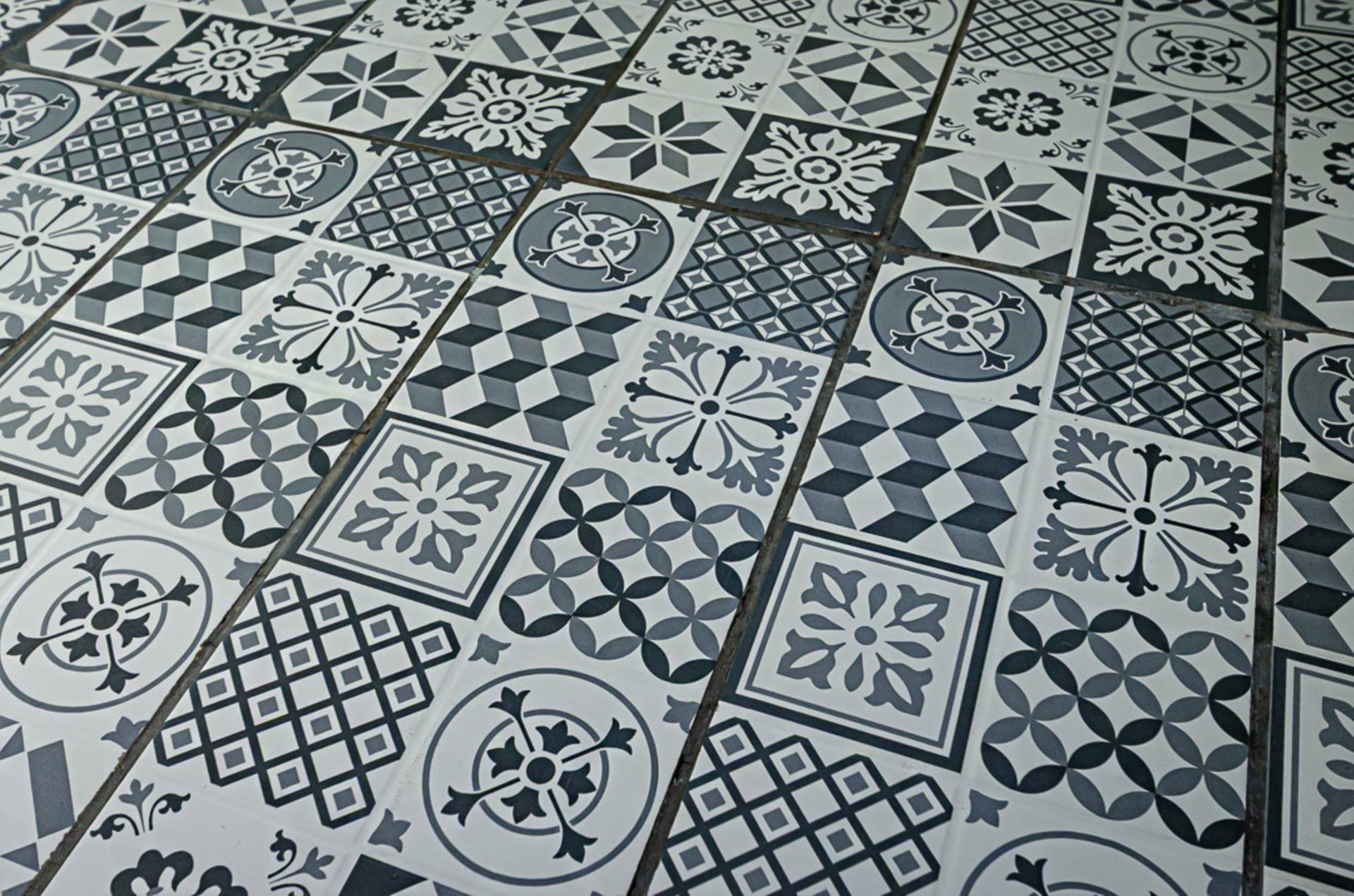 Shower cubicle with electric shower and sliding door, wash hand basin in two drawer vanity unit, W.C., part tiled walls, decorative ceramic tiled floor and extractor fan