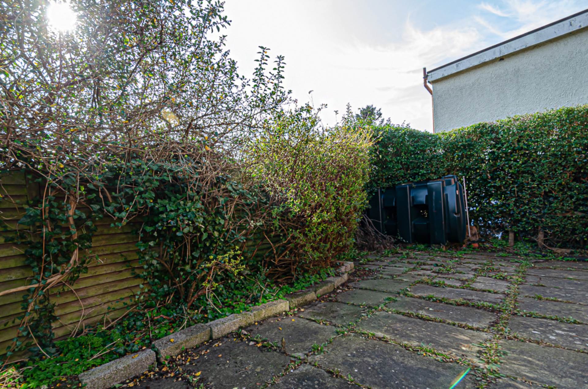 Front garden in small stones and tarmac driveway. Paved rear garden