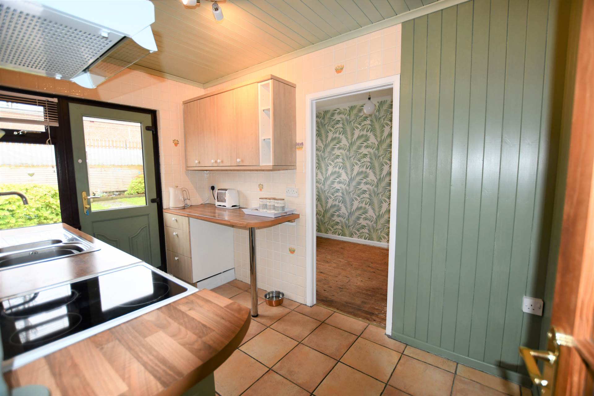 Single drainer stainless steel sink unit, mixer taps, range of built in high and low level units, part tiled walls, part tongue and groove, plumbed for washing machine, tongue and groove ceiling, breakfast bar, PVC back door.