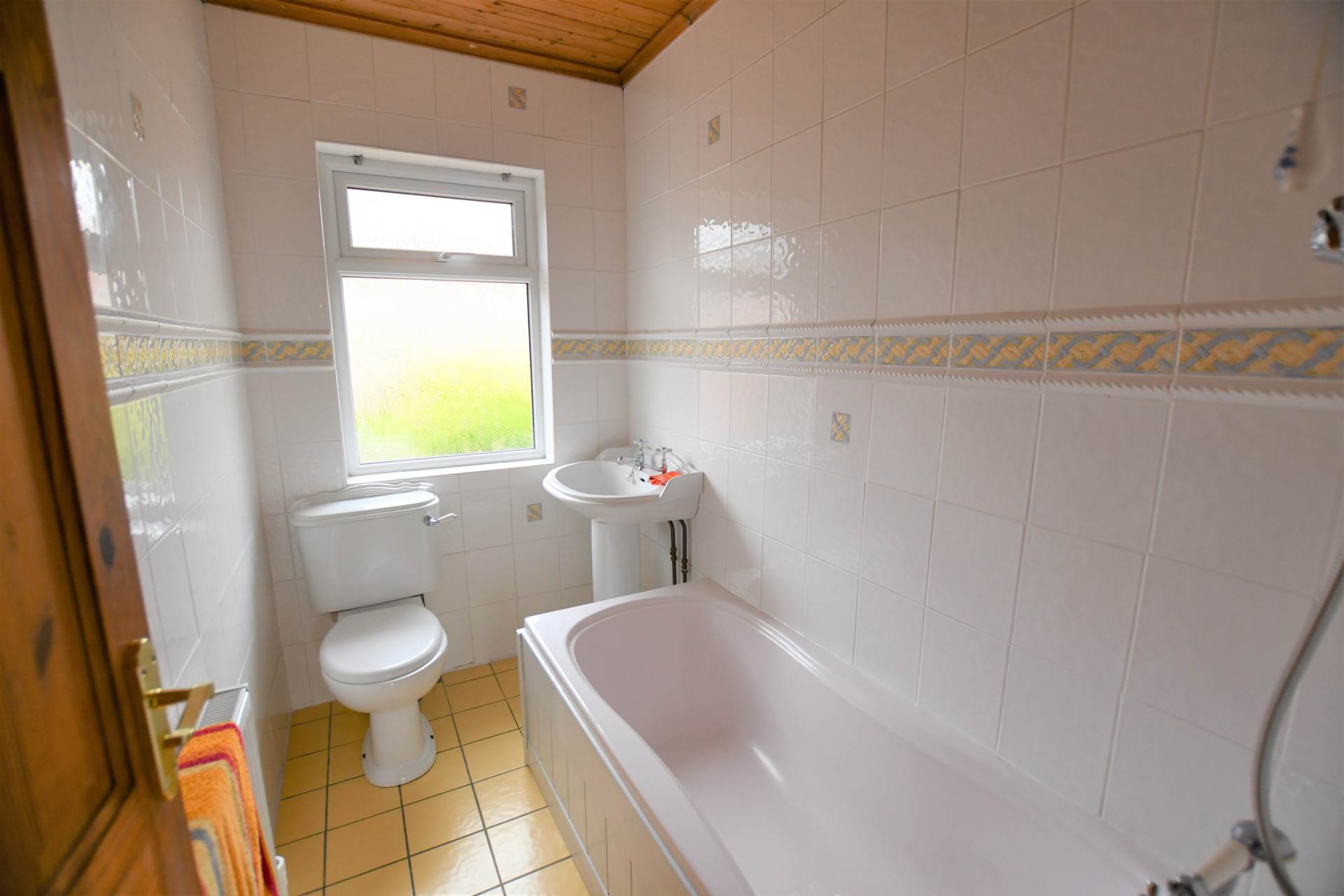 Paneled bath, thermostatically controlled shower, pedestal wash hand basin, low flush w.c., fully tiled walls, tiled floor, pine ceiling.